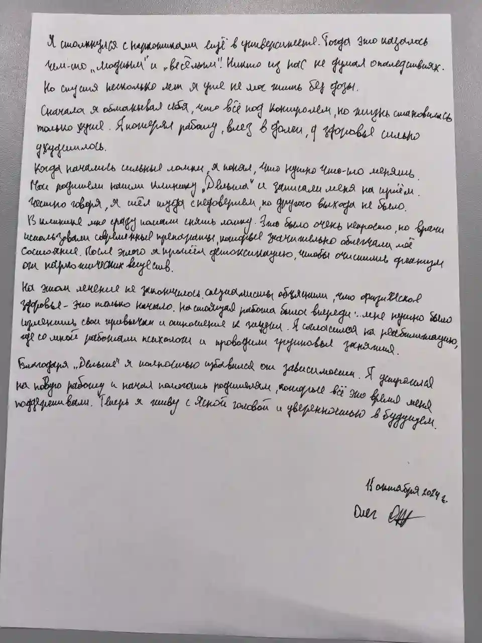 Благодаря "Дельте" я полностью избавился от зависимости. Я устроился на новую работу и начал помогать родителям, которые всё это время меня поддерживали. Теперь я живу с ясной головой и уверенностью в будущем.